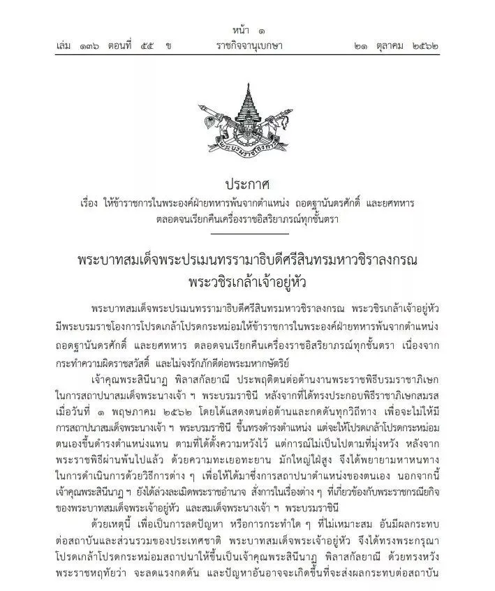 วันที่ 21 ต.ค. ราชกิจจานุเบกษา เผยแพร่ พระบรมราชโองการ ประกาศ เรื่องให้ข้าราชการในพระองค์ฝ่ายทหารพ้นจากตำแหน่ง ถอดฐานันดรศักดิ์ และยศทหาร ตลอดจนเรียกคืนเครื่องราชอิสริยาภรณ์ทุกชั้นตรา ความว่า