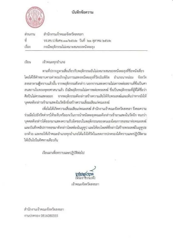 เพื่อไม่ได้เกิดความเสื่อมเสีย แก่คณะสงฆ์สำนักงานเจ้าคณะจังหวัดสงขลาจึงขอความร่วมมือไปยังวัดต่าง ๆ ให้ระงับหรือยกเว้นการนำหนังตะลุงคณะดังกล่าว เข้ามาแสดงในวัดอีก จนกว่าบุคคลดังกล่าวได้ออกมาแสดงความรับผิดชอบ ในพฤติกรรมของตนเอง โดยการขอขมาต่อคณะสงฆ์ และบันทึกคลิปการขอขมาดังกล่าวโพสต์ลงในยูทูป และให้ลบโพสต์ที่กล่าวใส่ร้ายพระสงฆ์ในยูทูปออกด้วย และขอให้เจ้าคณะอำเภอทุกอำเภอได้แจ้งให้วัดในเขตการปกครองได้ทราบและปฏิบัติตาม ให้เป็นไปในทิศทางเดียวกันเรียนมาเพื่อทราบและปฏิบัติต่อไป ลงชื่อพระราชวรเวที