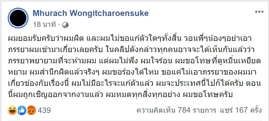 ผมยอมรับครับว่าผมผิด และผมไม่ขอแก้ตัวใดๆทั้งสิ้น วอนพี่ๆน้องๆอย่าเอาภรรยาผมเข้ามาเกี่ยวเลยครับ ในคลิปดังกล่าวทุกคนอาจจะได้เห็นกันแล้วว่าภรรยาพยายามที่จะห้ามผม แต่ผมไม่ฟัง ผมใจร้อน ผมขอโทษที่ดูหมิ่นเหยียดหยาม ผมสำนึกผิดแล้วจริงๆ ผมขอร้องได้ไหม ขอแค่ไม่เอาภรรยาของผมมาเกี่ยวข้องกับเรื่องนี้ ผมไม่มีอะไรจะแก้ตัวแล้ว ผมจะประเทศนี้ไปก็ได้ครับ ตอนนี้ผมถูกเชิญออกจากงานแล้ว ผมหมดทุกสิ่งทุกอย่าง ผมขอโทษครับ