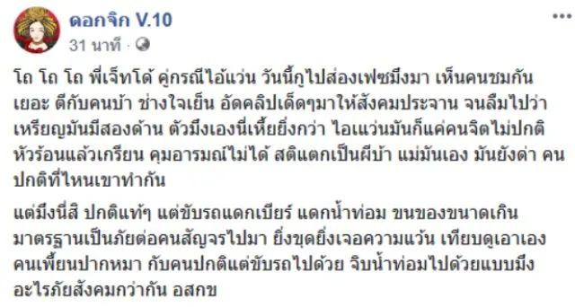 กำลังเป็นที่วิพากวิจารณ์กันในโลกโซเชี่ยล เมื่อผู้ใช้เฟสบุ๊ก โต้ เจ็ทโด้ เผยคลิปเหตการณ์ ขณะเคลียกับคู่กรณี โดยในคลิปจะเห็นว่าผู้ขับรถยนฮอนด้าซีวิค มีท่าทีโมโห พร้อมกับพูดทำนองดูถูกตลอดเวลา มีปัญญาซื้อรถ แถมอวดมีเงินเป็นล้านๆ ทั้งที่แฟนสาว ห้ามหนุ่มขับซีวิคแต่ไม่เป็นผล โดยข้อความที่ผู้โพสต์ระบุว่า