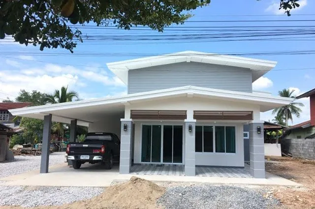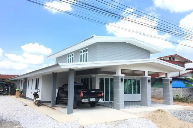บ้านหลังนี้เป็นของ บ้านคุณแอน อยู่ในพื้นที่ อ.วังสะพุง จ.เลย ลักษณะเดิมเป็นบ้านไม้สองชั้น รีโนเวทเพิ่มความทันสมัยเข้าไป เปลี่ยนผนังไม้ด้านบนเป็นไม้เฌอร่า โทนสีเทา ด้านล่างก่อผนังกั้นเป็นห้องต่าง ๆ เพิ่มพื้นที่ใช้สอยด้านหน้า ด้านข้างเทคอนกรีตทำเป็นที่จอดรถ และส่วนหน้าบ้านก็ปูกระเบื้อง เป็นพื้นที่อเนกประสงค์ หลังคาชั้นบนเป็นทรงจั่ว ด้านล่างบริเวณหน้าบ้านก็ทรงจั่ว และต่อให้ยาวออกด้านข้างด้วย
