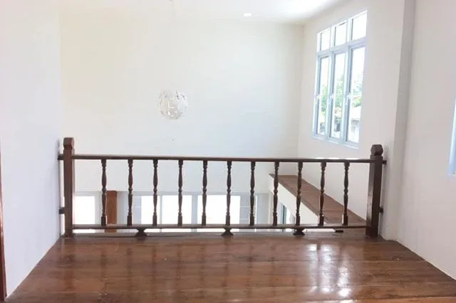 ลานด้านบนเป็นไม้เก่า ที่มีการขัดและเคลือบเงาอย่างดี มีราวกันตกด้วย