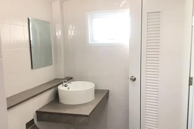 ประตูห้องน้ำทำจาก PVC สีเทา อ่างล้างหน้าดีไซน์สวยเก๋