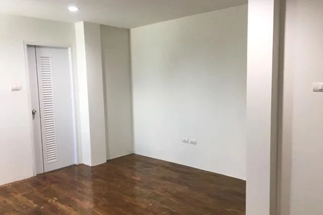 ในส่วนห้องนอนชั้นบน ผนังทาด้วยโทนสีขาว ส่วนพื้นเป็นไม้ขัด เคลือบเงาอย่างดี