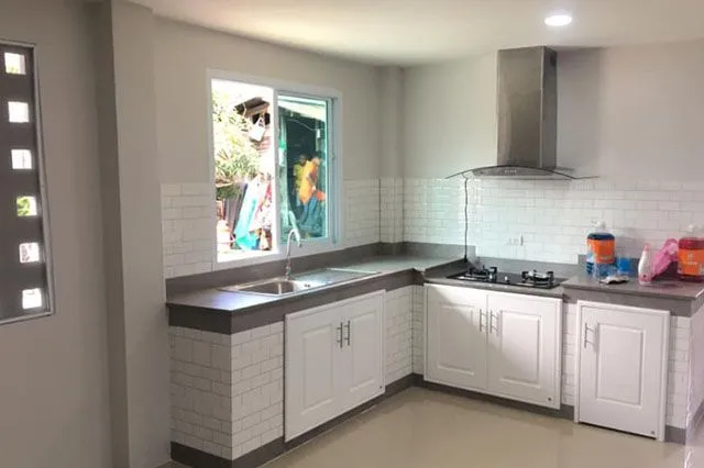 ห้องครัวอยู่ชั้นล่างของบ้าน ติดตั้งเคาน์เตอร์รูปตัวแอล ที่ปูกระเบื้องสีขาวและเทา มีส่วนเตรียมอาหาร ติดตั้งเตาแก๊สแบบสองหัว มีซิ้งค์ล้านจาน และเครื่องดูดอากาศด้วย หน้าต่างกระจกแบบบานเลื่อนทางเดียว ก็มีส่วนช่วยในการระบายกลิ่น ที่เกิดเวลาทำกับข้าวได้อีกทางหนึ่ง