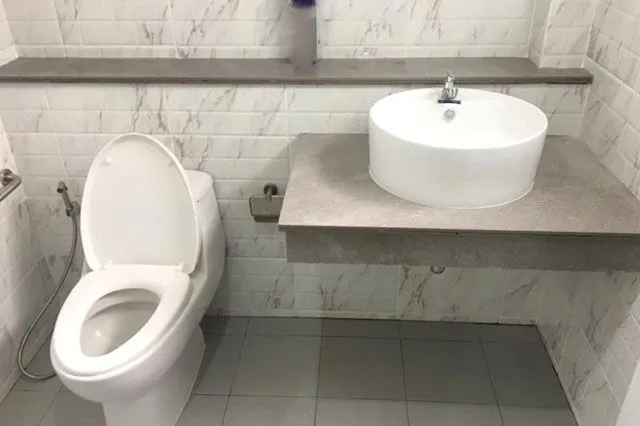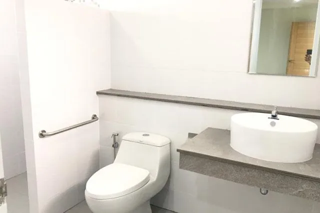ห้องน้ำ ผนังเป็นโทนสีขาว ชั้นอ่างล้างหน้า ชั้นวางของเป็นสีเทา มีเครื่องสุขภัณฑ์ครบครัน