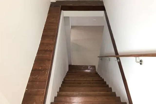 บันไดไม้ขึ้นไปชั้นสองของบ้าน เคลือบเงาสวยมาก