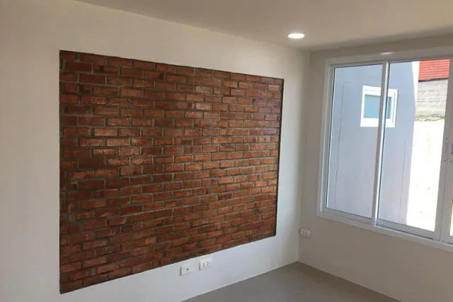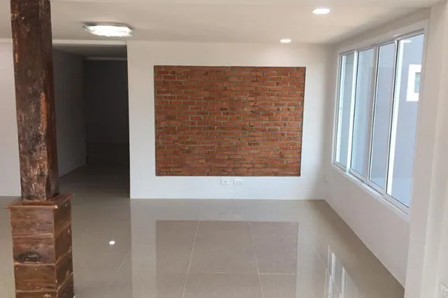 ห้องโถงที่ผสมผสานบ้านในแบบเดิมคือเสาไม้ เข้ากับผนังอิฐ หน้าต่างที่เป็นกระจก ได้อย่างสวยงามลงตัว