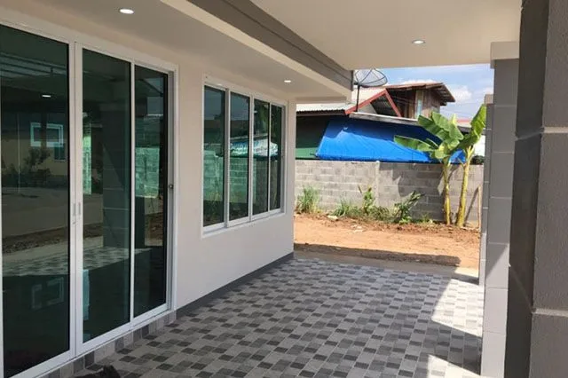 เสาหน้าบ้านขนาดใหญ่ สามต้นหน้าบ้าน ทำให้เป็นจุดเด่นของบ้าน ฝ้าหลังคาเฉลียงหน้าบ้านเป็นฝ้าเรียบ ประตูหน้าบ้านและหน้าต่าง เป็นกระจกแบบบานเลื่อน ผนังด้านล่างทาด้วยโทนสีเทาอ่อน ไม้ด้านบนชั้นสองเพิ่มระดับสีเทาให้เข้มขึ้น เพิ่มมิติความสวยงามให้กับบ้านได้สวยยิ่งขึ้น