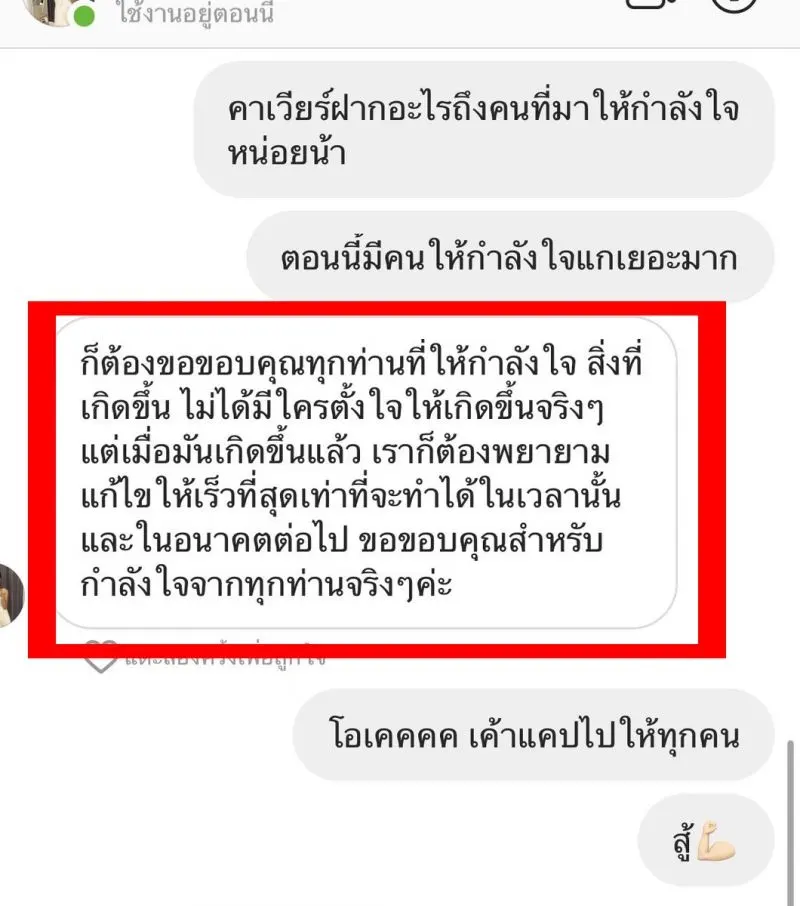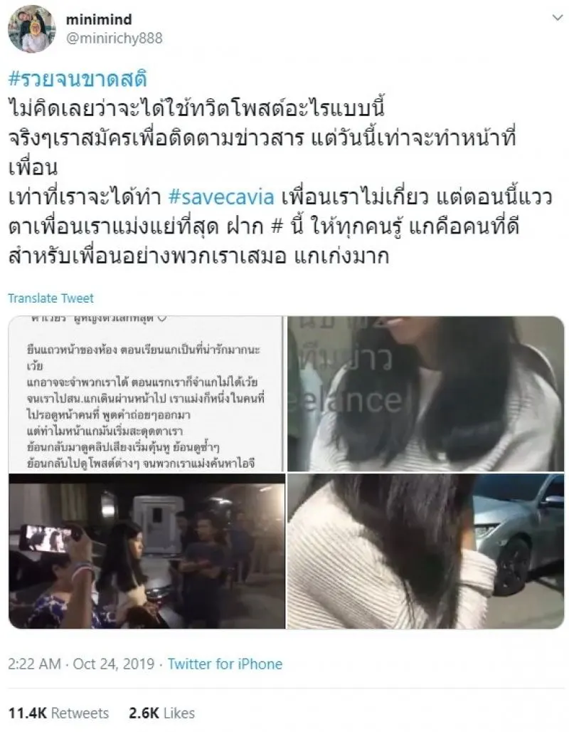ทั้งนี้ เจ้าของทวิตเตอร์ได้ชื่นชมคาเวียร์ว่าเรื่องที่เกิดขึ้นเจ้าตัวทำดีที่สุดแล้ว แม้เธอจะไม่รู้จักนายรชฏ แต่เธอรู้ดีว่าคาเวียร์เป็นคนอย่างไร และขอเป็นกระบอกเสียงเล็กๆ ปกป้องเพื่อน