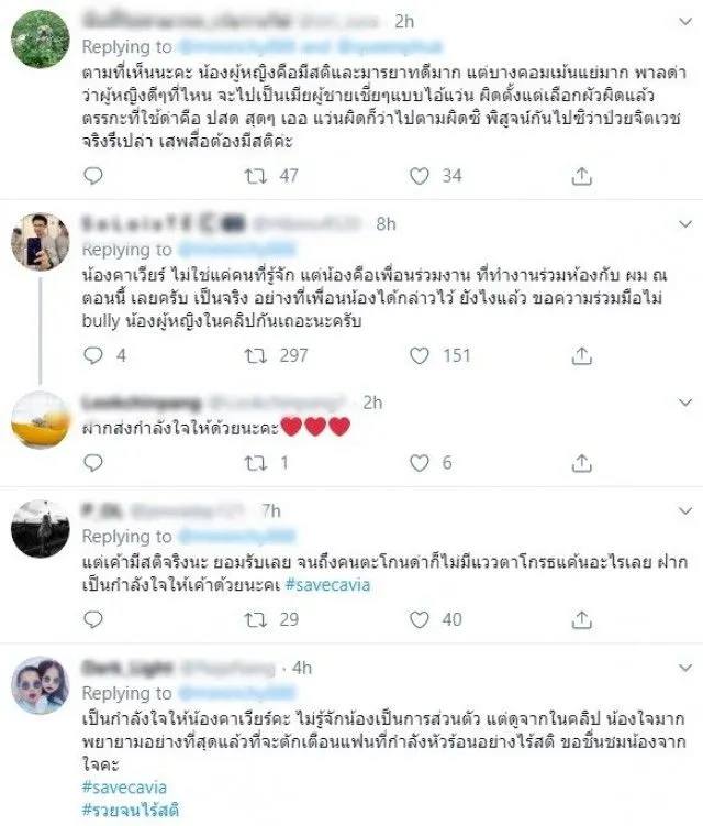 จากกรณีสมาชิกทวิตเตอร์ minirichy888 ได้ออกมาโพสต์ข้อความ ถึงผู้ที่อยู่ในเหตุการณ์อีกคน คือ แฟนสาวของหนุ่มแว่น ซึ่งคืนที่ผ่านมาโดนชาวบ้าน ตะโกนว่า ด้วยนั้น ว่า ไม่คิดเลยว่าจะได้ใช้ทวิตโพสต์อะไรแบบนี้ จริงๆ เราสมัครเพื่อติดตามข่าวสาร แต่วันนี้เท่าจะทำหน้าที่เพื่อน เท่าที่เราจะได้ทำ savecavia เพื่อนเราไม่เกี่ยว แต่ตอนนี้แววตาเพื่อนเรา แย่ที่สุด ฝาก นี้ ให้ทุกคนรู้ แกคือคนที่ดีสำหรับเพื่อนอย่างพวกเราเสมอ แกเก่งมาก