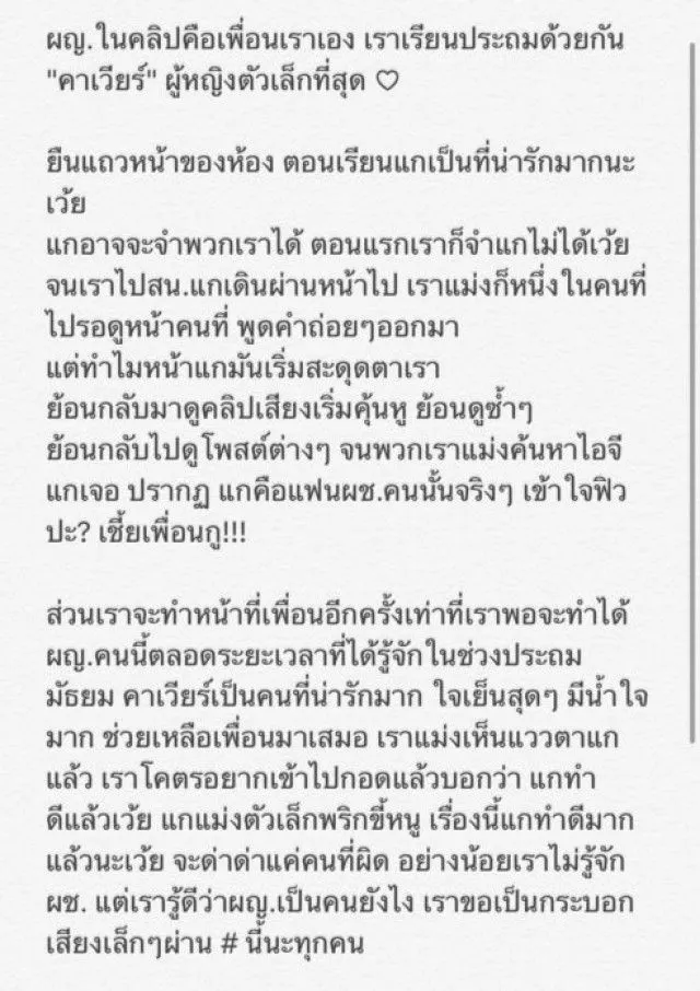ต่อมาสมาชิกทวิตเตอร์ minirichy888 ได้ออกมาโพสต์ข้อความ ถึงผู้ที่อยู่ในเหตุการณ์อีกคน คือ แฟนสาวของหนุ่มแว่น ซึ่งคืนที่ผ่านมาโดนชาวบ้าน ตะโกนว่า ด้วยนั้น ว่า ไม่คิดเลยว่าจะได้ใช้ทวิตโพสต์อะไรแบบนี้ จริงๆ เราสมัครเพื่อติดตามข่าวสาร แต่วันนี้เท่าจะทำหน้าที่เพื่อน เท่าที่เราจะได้ทำ savecavia เพื่อนเราไม่เกี่ยว แต่ตอนนี้แววตาเพื่อนเรา แย่ที่สุด ฝาก นี้ ให้ทุกคนรู้ แกคือคนที่ดีสำหรับเพื่อนอย่างพวกเราเสมอ แกเก่งมาก