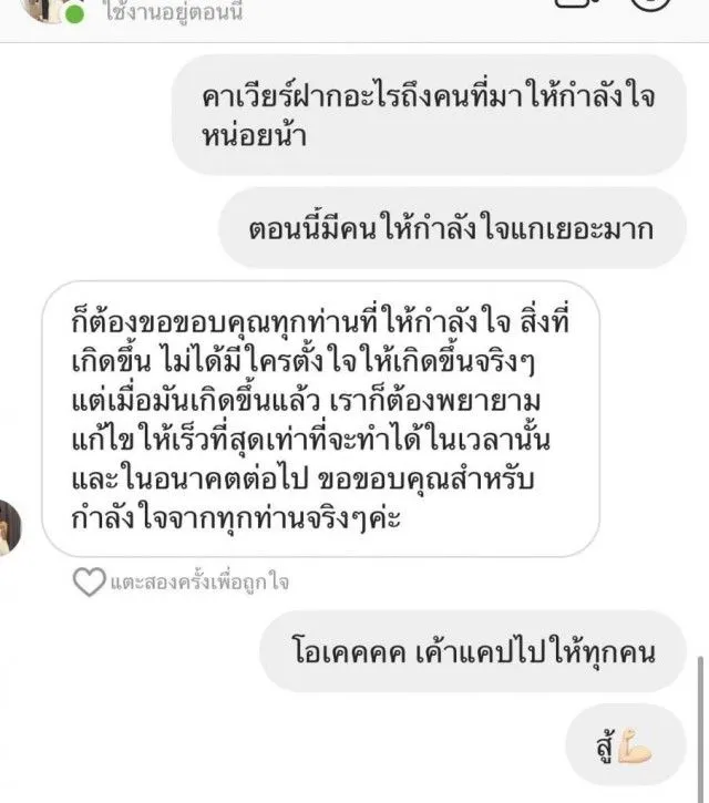 ล่าสุดผู้ใช้ทวิเตอร์รายหนึ่งที่บอกว่าเธอเป็นเพื่อนสมัยเรียนของน้องคาร์เวียร์ แฟนสาวของหนุ่มแว่นที่เป็นข่าวโด่งดังอยู่ตอนนี้ ได้เผยแชทของน้องคาร์เวียร์ที่ฝากถึงทุกคนที่ให้กำลังใจเธอ โดยเพื่อนนั้นได้แคปแชทมาให้ทุกคนดู ซึ่งนอกจากจะถามไถ่กันแล้ว น้องคาร์เวียรยังฝากข้อความถึงทุกคนความว่า ก็ต้องขอขอบคุณทุกท่านที่ให้กำลังใจ สิ่งที่เกิดขึ้น ไม่ได้มีใครตั้งใจให้เกิดขึ้นจริงๆ แต่เมื่อมันเกิดขึ้นแล้ว เราก็ต้องพยายามแก้ไขให้เร็วที่สุดเท่าที่จะทำได้ในเวลานั้น และในอนาคตต่อไป ขอขอบคุณสำหรับกำลังใจจากทุกทุกท่านจริงๆ ค่ะ