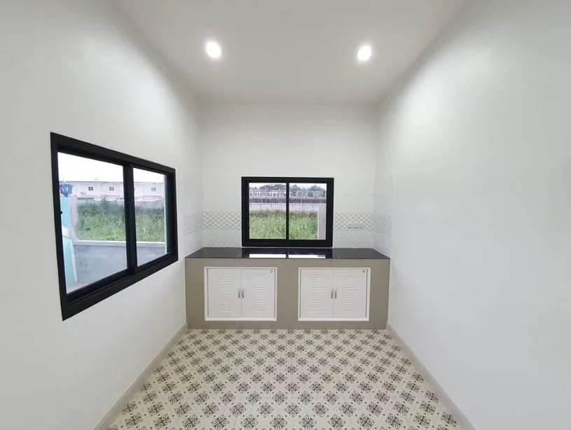 บริเวรห้องครัวมีการติดตั้งเค้าเตอร์ไว้เก็บถ้วนจาน บริเวณหน้าต่าง ปูพื้นด้วยกระเบื้องลายดอกไม้ ผนังของห้องครัวนั้นใช้โทนสีขาว