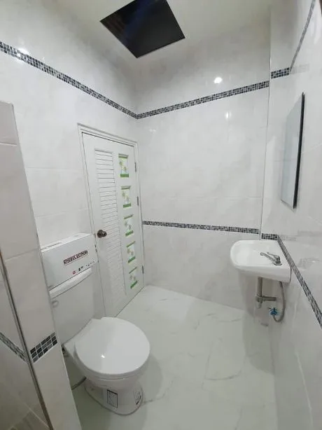 ภายในบริเวณห้องน้ำ ตกแต่งด้วยกระเบื้องสีขาว มีการแยกส่วนที่เป็นที่อาบน้ำโดยการก่อิฐขึ้นมากั้นอย่างพอเหมาะ ปูพื้นด้วยกระเบื้องสีขาวลายหินอ่อน และติดตั้งอ่างล้างหน้ากับกระจกส่องหน้าภายในห้องน้ำด้วย