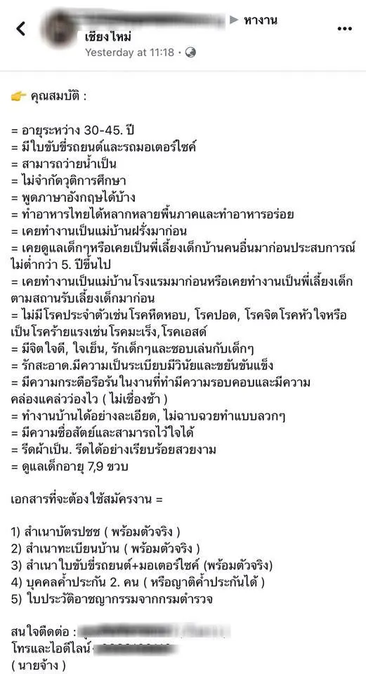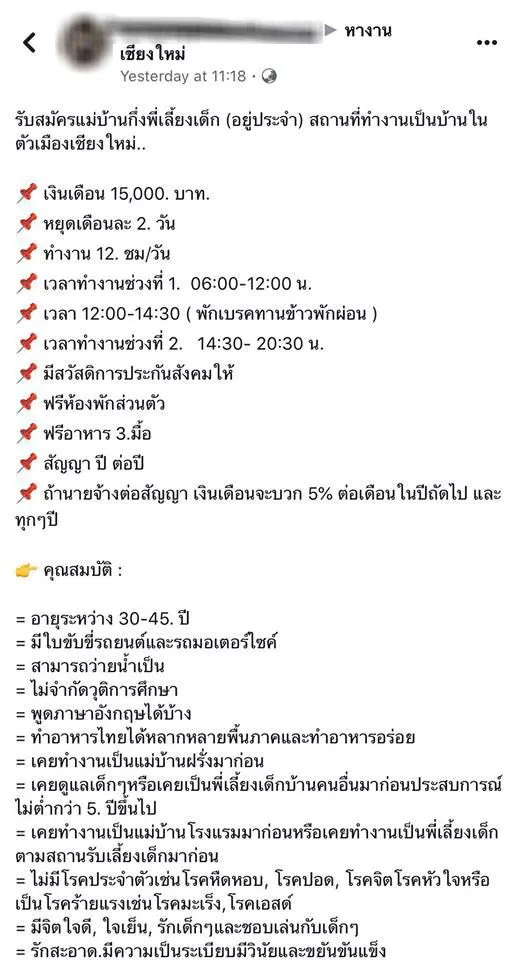 วันที่ 25 ต.ค.62 เพจ ขอโทษนะคะ ที่เพื่อนทำตัวแบบนี้ เผยโพสต์ประกาศหาแม่บ้าน (กึ่งพี่เลี้ยง) จากกลุ่มหางานเชียงใหม่ ได้ค่าจ้าง 15,000 บาท พร้อมคุณสมบัติที่แม่บ้านจะต้องมี เช่น ว่ายน้ำเป็น, พูดภาษาอังกฤษได้, เคยเป็นแม่บ้านฝรั่งมาก่อน, ทำอาหารอร่อย, มีประสบการทำงานที่โรงแรม หรือทำงานเป็นพี่เลี้ยงมาก่อน, ไม่มีโรคประจำตัว และอื่นๆ อีกหลายข้อ
