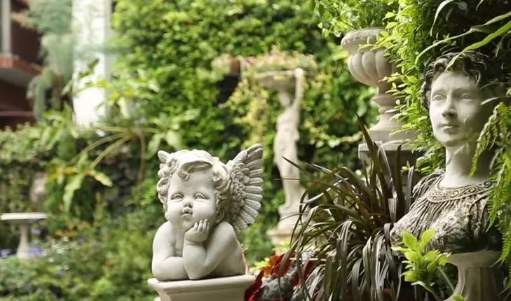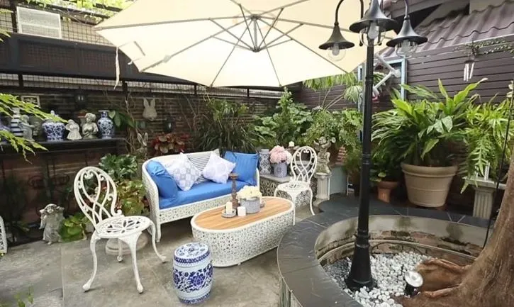 สำหรับสวนของบ้านหลังนี้ ตกแต่งในสไตล์อังกฤษ พร้อมรูปปั้นสุดหรูและดอกไม้สุดสวยเพียบ โดยเธอเป็นคนลงมือออกแบบและจัดสวนเองทั้งหมด นอกจากนี้ยังมีกรงแมวนอกบ้าน พร้อมแคตวอล์กแนวยาวให้แมงได้วิ่งเล่นด้วย เรียกได้ว่าเป็นบ้านที่อบอุ่น ร่มรื่น และน่าอยู่จริงๆ
