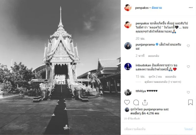 โดยเธอได้โพสต์ผ่านไอจีระบุข้อความว่า ทุกสิ่งเกิดขี้น ตั้งอยู่ และดับไปไม่มีคำว่าตลอดไป ในโลกนี้ ขอบคุณทุกๆกำลังใจที่ส่งมานะคะ
