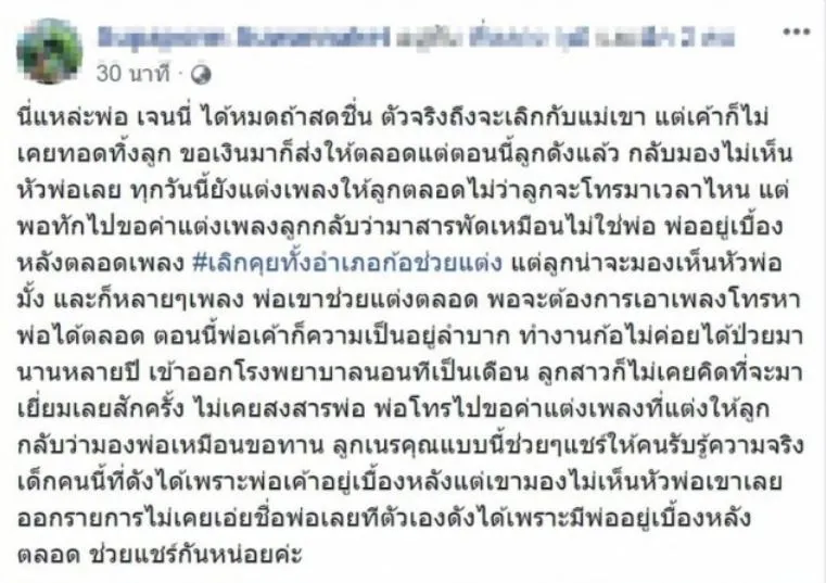 ส่วนเรื่องการแต่งเพลง ตนเองก็ของด เพราะแต่งแล้วเรียกเงินก็ทำให้เข้าใจผิด ในฐานะพ่อ เชื่อว่าเดี๋ยวนี้ลูกเก่ง แต่งเองได้ ไม่มีพ่อลูกก็ไม่เป็นไรลูกเก่งอยู่แล้ว