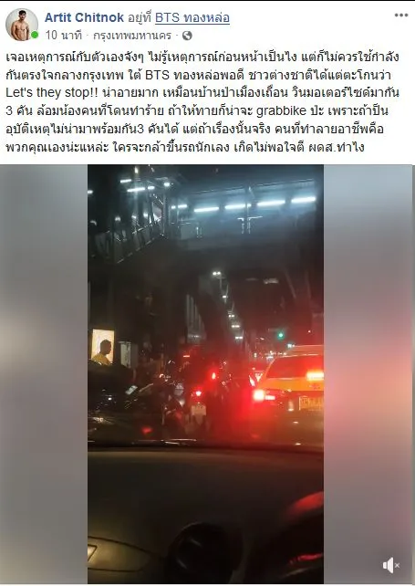 เจอเหตุการณ์กับตัวเองจังๆ ไม่รู้เหตุการณ์ก่อนหน้าเป็นไง แต่ก็ไม่ควรใช้กำลังกันตรงใจกลางกรุงเทพ ใต้ BTS ทองหล่อพอดี ชาวต่างชาติได้แต่ตะโกนว่า Let's they stop!! น่าอายมาก เหมือนบ้านป่าเมืองเถื่อน วินมอเตอร์ไซด์มากัน 3 คัน ล้อมน้องคนที่โดนทำร้าย ถ้าให้ทายก็น่าจะ grabbike ป่ะ เพราะถ้าป็นอุบัติเหตุไม่น่ามาพร้อมกัน3 คันได้ แต่ถ้าเรื่องนั้นจริง คนที่ทำลายอาชีพคือพวกคุณเองน่ะแหล่ะ ใครจะกล้าขึ้นรถนักเลง เกิดไม่พอใจตี ผดส.ทำไง