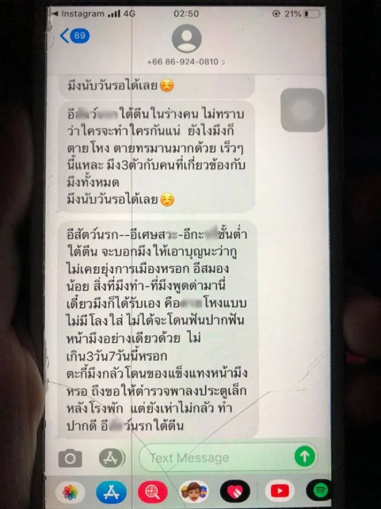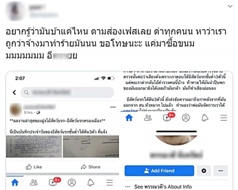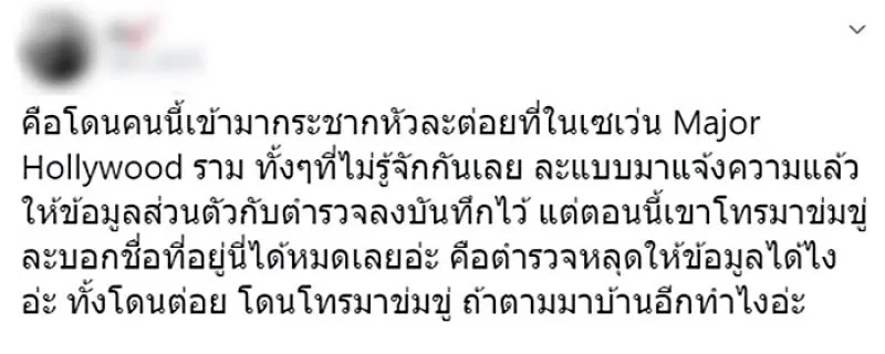 หลังจากนั้น ตน พี่สาว และแม่ ได้เข้าแจ้งความตำรวจ สน.หัวหมาก แต่ตำรวจอ้างว่าเขาเป็นคนสติไม่ดี ดำเนินคดีไม่ได้ แถมตำรวจยังทำข้อมูลส่วนตัวของตนรั่ว ทั้งเบอร์โทร. และที่อยู่ ทำให้หญิงสติไม่ดีคนดังกล่าวส่งข้อความมาด่าตนรัว ๆ แช่งให้ตนกับครอบครัวตาย แถมโทร. มาด่าสารพัด ข่มขู่บอกจะมาหาที่บ้านอีก ทำให้ตนรู้สึกไม่ปลอดภัยอย่างมาก