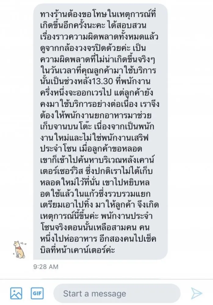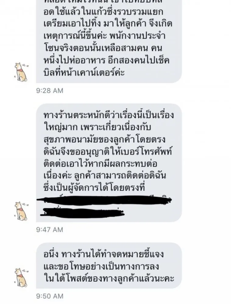 ล่าสุดร้านออกชี้แจงทันที ซึ่งเจ้าของโพสต์ก็ระบุว่า ขอบคุณทางร้านมากๆที่แสดงความรับผิดชอบ และให้เรื่องของเราเป็นเรื่องที่คอยเตือนให้ทุกคนระวังสุขอนามัยของตัวเองไม่ว่าจะไปทานอาหารที่ไหนกันนะคะ