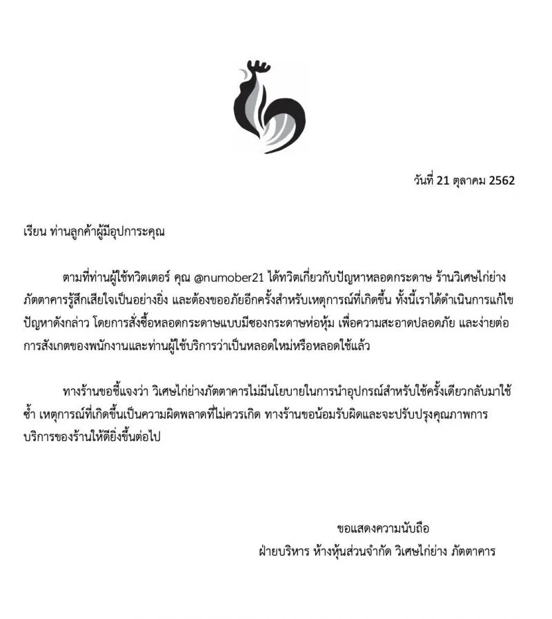 จากกรณีในทวิตเตอร์ @numober21 โพสต์ข้อความระบุว่า ร้าน…ไก่ย่างแยกบางโพ พนักงานเสิร์ฟเอาหลอดที่ใช้แล้วมาให้โต๊ะเรา โดยที่เราก็ไม่ทันสังเกต มาเห็นอีกทีตอนกินน้ำหมดแก้วแล้วและเห็นรอยลิปสติกอยู่ปลายหลอดทั้งที่เราไม่ได้แต่งหน้า พอมาดูที่แก้วใส่หลอด(ที่คิดว่ายังไม่ได้ใช้) ก็เจอหลอดบางอันมีลิปติด แถมบางอันมีน้ำเขียวติดด้วย