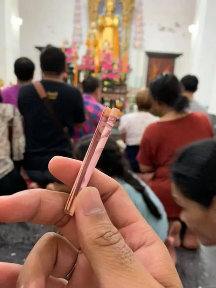 ผู้คนยืนมองแบงค์ร้อยใบนี้ แต่ไม่มีใครเก็บสักที สุดท้ายผมและแฟนตัดสินใจเก็บมา และข้ามเรือมาเพื่อทำบุญให้เขาตามคำขอ เพื่อไม่ให้ความหวังสุดท้ายของพี่นั้นสูญเปล่า ผมทำบุญให้พี่ ตามที่พี่ขอแล้วนะครับ