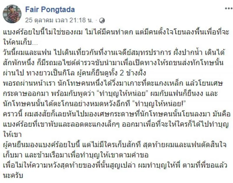 โดยเจ้าของเฟซบุ๊กชื่อ Fair Pongtada ได้โพสต์ภาพพร้อมเล่าเรื่องราวที่เกิดขึ้นว่า แบงค์ร้อยใบนี้ไม่ใช่ของผม ไม่ได้มีคนทำตก แต่มีคนตั้งใจโยนลงพื้นเพื่อที่จะให้คนเก็บ วันนี้ผมและแฟน ไปเดินเที่ยวกันที่งานเจดีย์สมุทรปราการ ฝั่งปากน้ำ เดินได้สักพักหนึ่ง ก็มีรถมอเตอร์ไซต์ตำรวจขับนำมาเพื่อเปิดทางให้รถขนส่งน.ช.นั้นผ่านไป ทางยาวเป็นกิโล ผู้คนก็ยืนดูทั้ง 2 ข้างฝั่งพอรถผ่านหน้าเรา