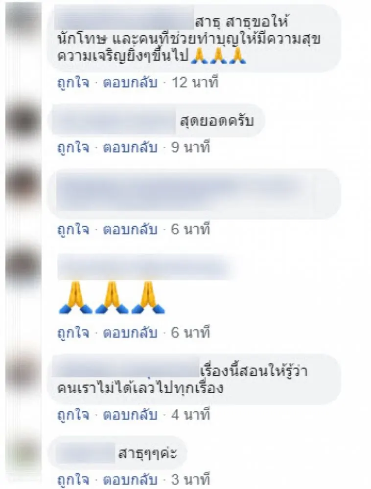 ทั้งนี้ ยังมีชาวเน็ตเข้ามาแสดงความคิดเห็นกันอย่างต่อเนื่อง โดยส่วนใหญ่เข้ามาชื่นชมหนุ่มคนนี้ที่ได้เป็นตัวแทนเขาในการทำบุญที่ดูเหมือนว่าจะเป็นครั้งสุดท้ายของน.ช.คนนั้น บ้างก็เข้ามาคอมเม้นต์ว่า ขอให้บุญกุศลที่คุณทำให้พี่เค้าในครั้งนี้จงดลบันดาลให้คุณและครอบครัว จงมีแต่ความสุขความเจริญนะคะ สาธุโมทนาบุญด้วยค่ะ บ้างก็เข้ามาคอมเม้นต์ว่า ขอให้ผลบุญนี้ ทำให้น.ช.คนนั้นพบทางสว่าง หรือพ้นจากทุกข์ นะคะ