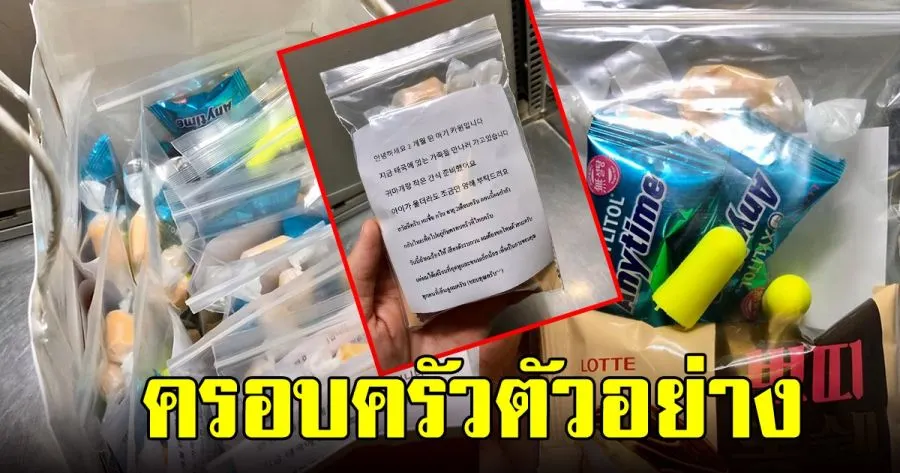 นี่คือครอบครับตัวอย่างเลย ผู้โดยสารเดินทางขึ้นเครื่องพร้อมทารกชื่อน้องกวิน แต่ผู้โดยสารเกรงว่าหากน้องร้องไห้อาจส่งเสียงรบกวนผู้โดยสารท่านอื่น เลยนำ ear plug ใส่ซองพร้อมข้อความและขนมเตรียมไว้ 12 อัน ฝากลูกเรือไว้แจกผู้โดยสารรอบข้างเผื่อน้องร้องไห้