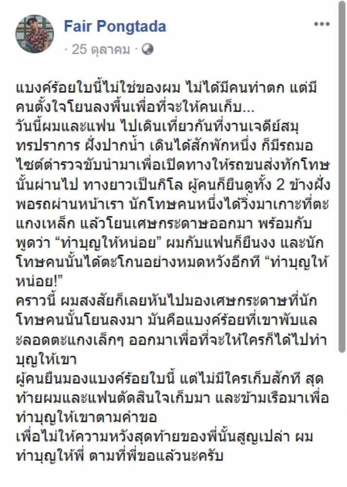 ชาวเน็ตจับโป๊ะ หนุ่มโพสต์ น.ช. โยนแบงค์ 100 ฝากทำบุญ อาจเป็นแค่เรื่องแต่ง