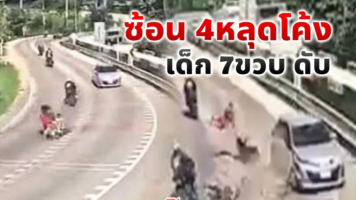 วินาที 4 เด็กหญิงวัย 7-15 ปี ซ้อน 4 หลุดโค้งชนเก๋งกระเด็น น้องเล็ก 7 ขวบ ไม่รอด(คลิป)