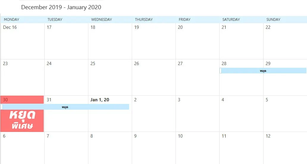 29 ต.ค. 2562 โฆษกรัฐบาลเผย ที่ประชุมคณะรัฐมนตรี มีมติเห็นชอบกำหนดให้วันจันทร์ที่ 30 ธ.ค. 62 เป็นหยุดราชการเป็นกรณีพิเศษ เนื่องจากตรงกับช่วงเทศกาลวันขึ้นปีใหม่
