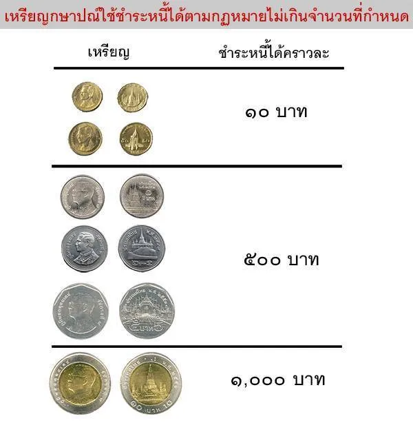 - 5, 10, 25, 50 สตางค์ ชำระหนี้ได้ครั้งละไม่เกิน 10 บาท