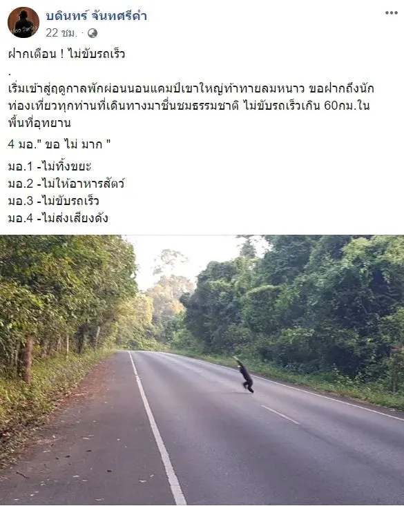 ผู้ใช้เฟซบุ๊คโพสต์ข้อความระบุว่า “ฝากเตือน ! ไม่ขับรถเร็ว เริ่มเข้าสู่ฤดูกาลพักผ่อนนอนแคมป์เขาใหญ่ท้าทายลมหนาว ขอฝากถึงนักท่องเที่ยวทุกท่านที่เดินทางมาชื่นชมธรรมชาติ ไม่ขับรถเร็วเกิน 60กม.ในพื้นที่อุทยาน 4 มอ.”ขอ ไม่ มาก” มอ.1 -ไม่ทิ้งขยะ มอ.2 -ไม่ให้อาหารสัตว์ มอ.3 -ไม่ขับรถเร็ว มอ.4 -ไม่ส่งเสียงดัง”