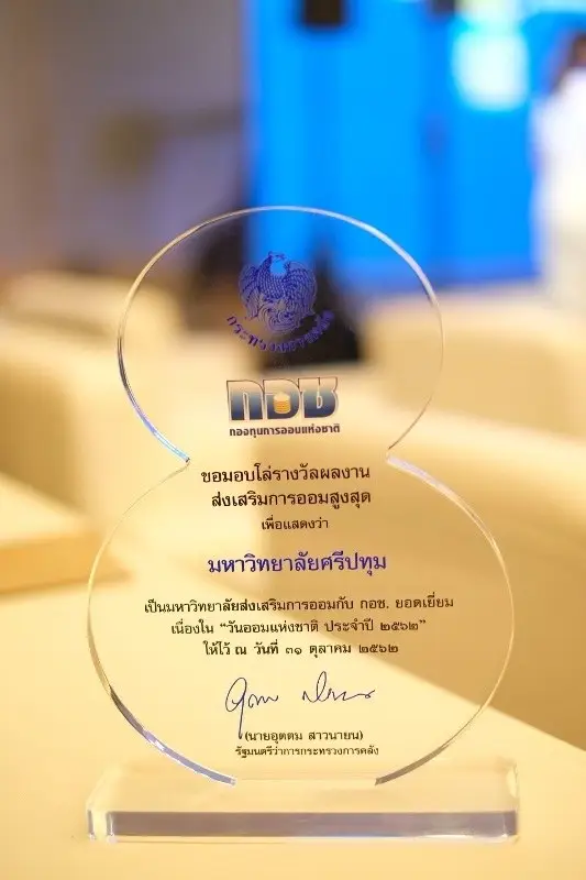 น้อมนำศาสตร์พระราชา ออมอย่างพอเพียง ม.ศรีปทุม มหาวิทยาลัยแห่งเดียวของประเทศ คว้ารางวัลผลงานส่งเสริมการออมสูงสุด “รางวัลส่งเสริมการออมกับ กอช. ยอดเยี่ยม” เนื่องใน “วันออมแห่งชาติ ประจำปี 2562”