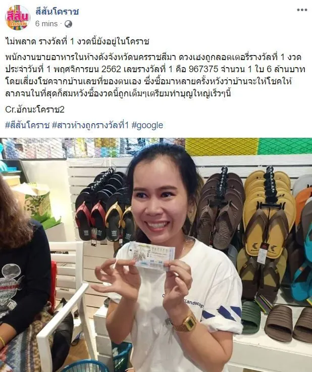 โดยทางเพจ สีสันโคราช ได้เผยภาพสาวผู้โชคดี ดวงเฮงในงวดนี้ คือ น้องกวาง คนประทาย ขายขนมญี่ปุ่น ร้านอยู่ชั้นใต้ดิน เดอะมอลล์โคราช ดวงเฮงถูกลอตเตอรี่รางวัลที่ 1 งวดประจำวันที่ 1 พฤศจิการยน 2562 เลขรางวัลที่ 1 คือ 967375 จำนวน 1 ใบ 6 ล้านบาทโดยเสี่ยงโชคจากบ้านเลขที่ของตนเอง ซึ่งซื้อมาหลายครั้งหวังว่าบ้านจะให้โชคให้ลาภจนในที่สุดก็สมหวังซื้องวดนี้ถูกเต็มๆเตรียมทำบุญใหญ่เร็วๆนี้