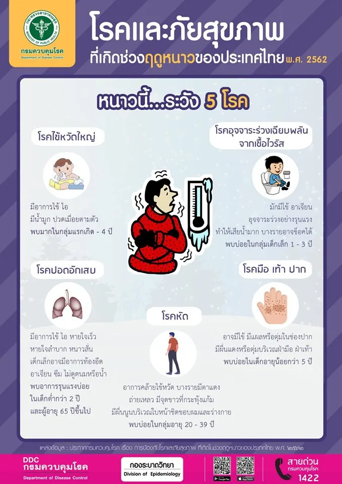 หลังจากที่ประชาชนชาวไทยเริ่มได้สัมผัสกับอาการหนาวเย็นช่วงปลายปี 2562 กันบ้างแล้ว แต่สิ่งหนึ่งที่ต้องระวังคือโรคและภัยสุขภาพที่มากับฤดูหนาว โดยทางด้าน กรมควบคุมโรค กระทรวงสาธารณสุข ได้ออกมาเตือนคนไทยให้ระวัง 5 โรคที่จะมาในหน้าหนาว มีดังนี้