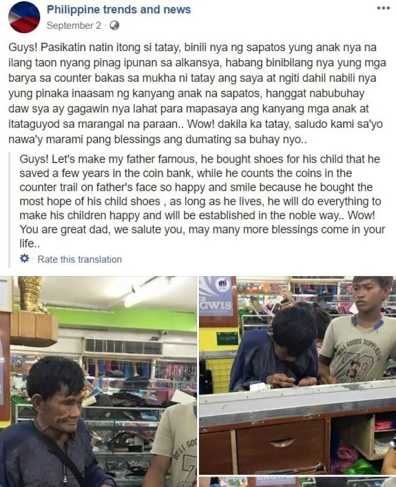 เรื่องราวอันสุดซึ้งประทับใจ กับความรักความห่วงใยของผู้เป็นพ่อที่มีต่อลูกชาย เเม้ว่าพ่อจะลำบากมากขนาดไหน ก็ยอมเสียสละ ทำเพื่อลูก โดยทางเพจ philippine trends and news ได้เผยเรื่องราวของพ่อลูกคู่หนึ่ง ที่ทางผู้เป็นพ่อได้อดออมเงินเพื่อที่จะมาซื้อรองเท้าคู่ใหม่ให้ลูก