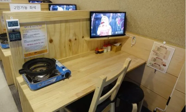 ที่บอกว่าร้านนี้เป็นร้านสำหรับคนโสดเพราะ โต๊ะที่นั่งทานอาหารนั้น คิดค้นขึ้นมาสำหรับการนั่งทานคนเดียวแบบชิล ๆ มีโต๊ะนั่งเรียง ๆ กันโดยมีที่กั้น มีเตาแก๊ส แถมยังมีทีวีเล็กๆ ไว้ให้ดูในขณะที่ทานไปด้วย ไม่มีคนคุยด้วยแต่ก็ไม่เหงาอีกต่อไป บอกเลยว่าอร่อยฟินมาก