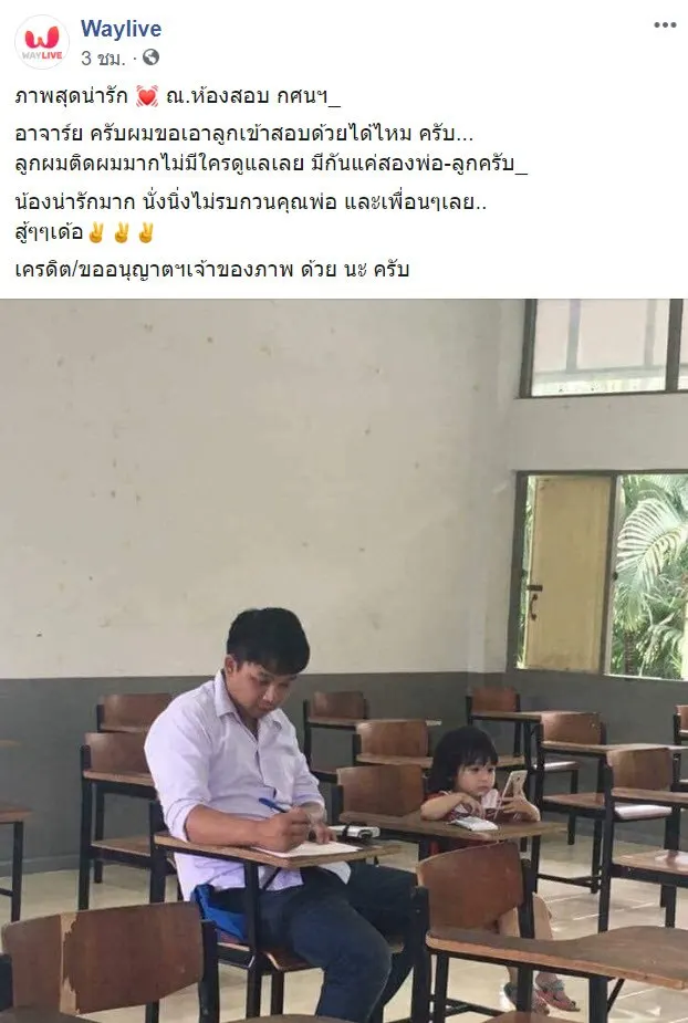 ชาวเน็ตแห่ให้กำลังใจหนุ่มรายหนึ่ง หลังจากที่แฟนเพจเฟซบุ๊ก Waylive ได้โพสต์ข้อความพร้อมภาพสุดประทับใจขณะที่ชายคนดังกล่าวนั่งทำข้อสอบอยู่ภายในห้องสอบ พร้อมกับเด็กหญิงวัยน่ารักกำลังนั่งเล่นโทรศัพท์มือถืออยู่ข้างๆ
