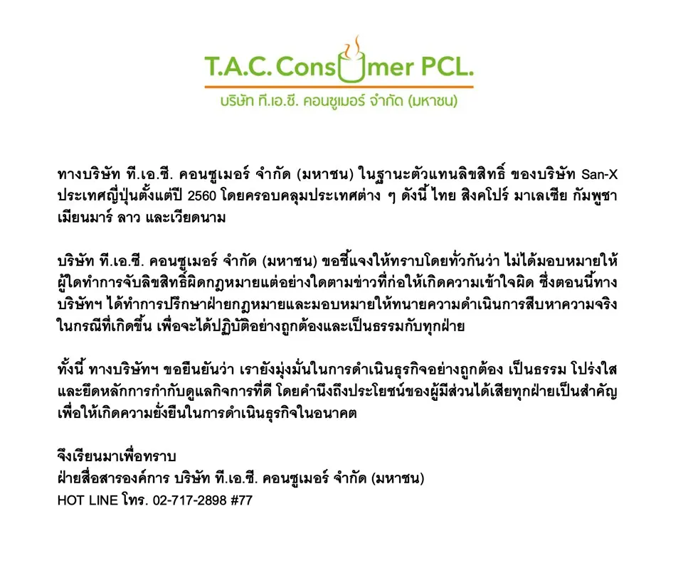 ตัวแทนลิขสิทธิ์ชี้แจง!! ยันไม่ได้มอบหมายให้ผู้ใดทำการจับลิขสิทธิ์ หลังมีผู้ถูกจับเพราะทำกระทงลายการ์ตูนริลัคคุมะ