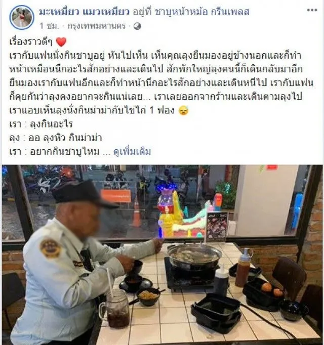 ผู้ใช้เฟสบุ๊คชื่อคุณ มะเหมี่ยว แมวเหมียว ได้โพสต์ภาพสุดประทับใจ โดยได้ระบุข้อความว่า เรื่องราวดีๆ เรากับแฟนนั่งกินชาบูอยู่ หันไปเห็น เห็นคุณลุงยืนมองอยู่ข้างนอกและก็ทำหน้าเหมือนนึกอะไรสักอย่างและเดินไป สักพักใหญ่ลุงคนนี้ก็เดินกลับมาอีก ยืนมองเรากับแฟนอีกและก็ทำหน้านึกอะไรสักอย่างและเดินหนีไป เรากับแฟนก็คุยกันว่าลุงคงอยากจะกินแน่เลย เราเลยออกจากร้านและเดินตามลุงไป เราแอบเห็นลุงนั่งกินม่าม่ากับไข่ไก่ 1 ฟอง