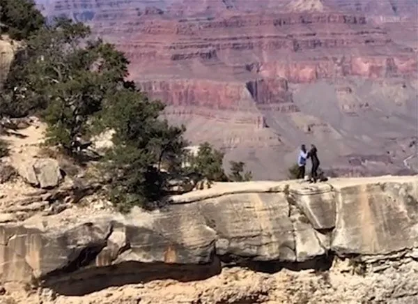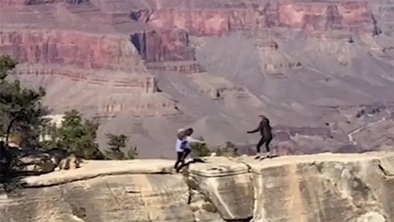 ภาพเหตุการณ์ต่อไปนี้เกิดขึ้นกับแม่ลูกคู่หนึ่ง ขณะถ่ายรูปจุดชมอุทยานแห่งชาติแกรนด์แคนยอนในอริโซนา สหรัฐอเมริกา หญิงคนหนึ่งเกือบจบชีวิตตัวเอง เพราะก้าวถอยหลังพลาดเกือบเสียหลัก