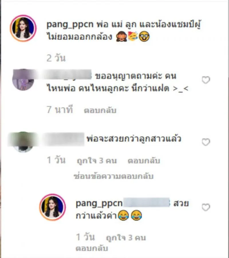 ล่าสุดน้องแป้งได้โพสต์ภาพคู่คุณพ่ออีกแล้ว แต่คราวนี้คุณพ่อถูกแฟนคลับทักเลยทีเดียว โดยอินสตาแกรมดังกล่าวระบุข้อความว่า พ่อ แม่ บุตร และน้องแชมป์ผู้ไม่ยอมออกกล้อง