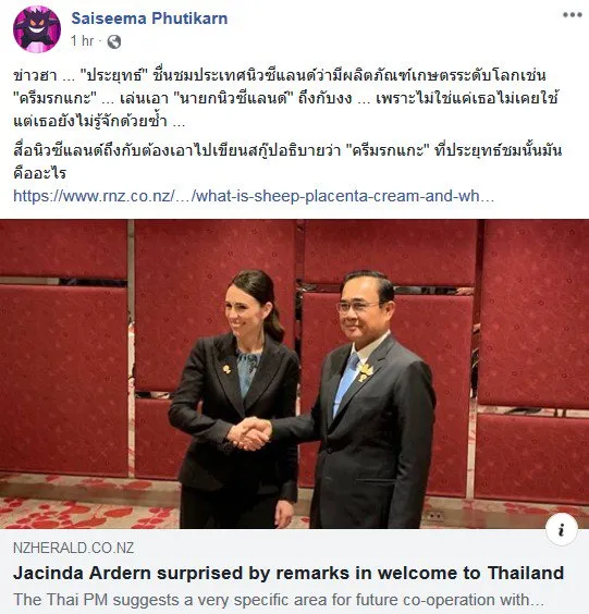 โดยสื่อในนิวซีแลนด์ได้ระบุข้อความส่วนหนึ่งว่า : Prime Minister Jacinda Ardern received an unexpected welcome to the East Asia Summit in Bangkok last night when her Thai host, Prime Minister Prayuth Chan-oca, praised New Zealand's sheep placenta cream.