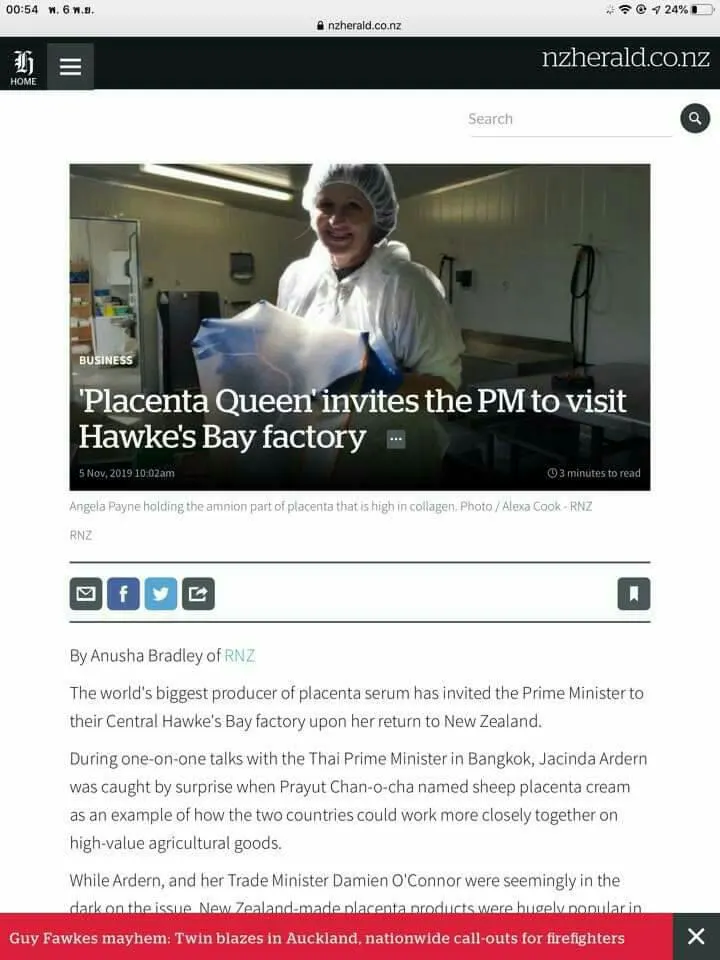สื่อรายใหญ่สุดของนิวซีแลนด์ นิวซีแลนด์ herald ก็ไปสัมภาษณ์เจ้าของโรงงานครีมรกรายใหญ่สุดของนิวซีแลนด์ ซึ่งเธอก็ยืนยันว่า มันเป็นสินค้าส่งออกคุณภาพดีที่โรงงานของเธอและอีกหลายๆแห่งผลิตเพื่อส่งออกจริงๆ โดยจะส่งออกไปในประเทศแถบเอเชียที่นิยมครีมพวกนี้ เช่น ไต้หวัน ไทย มาเลย์ จีน แต่ไม่ค่อยมีขายในประเทศเท่าไหร่