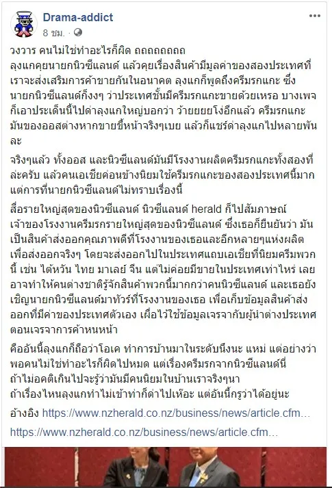 อย่างไรก็ตาม ทางเพจ Drama-addict ได้แสดงความคิดเห็นเกี่ยวกับประเด็นี้ว่า พลเอกประยุทธ์ได้ คุยกับนายกฯนิวซีแลนด์ ได้มีการพูดถึงเรื่องสินค้ามีมูลค่าของสองประเทศ ที่เราจะส่งเสริมการค้าขายกันในอนาคต โดยนายกฯตู่ได้ พูดถึงครีมรกแกะ ซึ่งนายกนิวซีแลนด์ก็งงๆ ว่าประเทศชั้นมีครีมรกแกะขายด้วยเหรอ