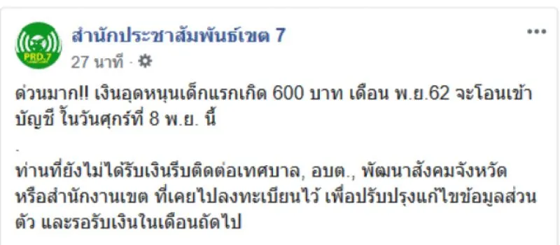 สำหรับแม่ๆที่ลงทะเบียนเงินอุดหนุนบุตรแรกเกิด เตรียมตัวเฮกันได้เลย เมื่อวันที่ 6 พฤศจิกายน 62 เพจ สำนักประชาสัมพันธ์เขต 7 ได้โพสต์ข้อความระบุว่า ด่วนมาก เงินอุดหนุนบุตรแรกเกิด 600 บาท เดือน พฤศจิกายน 62 จะโอนเข้าบัญชี ใันวันศุกร์ที่ 8 พฤศจิกายน นี้ ท่านที่ยังไม่ได้รับเงินรีบติดต่อเทศบาล อบต พัฒนาสังคมจังหวัด หรือสำนักงานเขต ที่เคยไปลงทะเบียนไว้ เพื่อปรับปรุงแก้ไขข้อมูลส่วนตัว และรอรับเงินในเดือนถัดไป